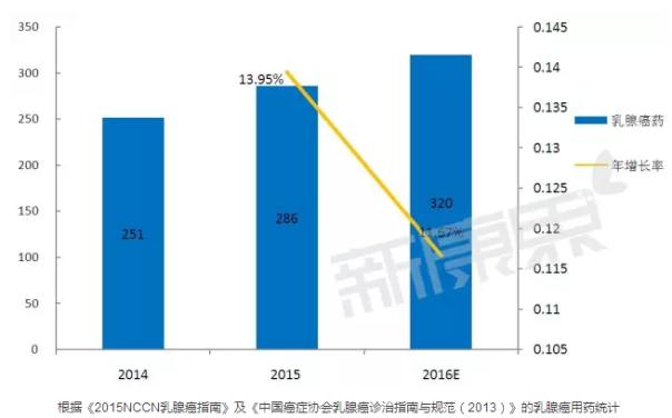 據(jù)中康CMH所監(jiān)測(cè)數(shù)據(jù)的統(tǒng)計(jì),2015年國(guó)內(nèi)乳腺癌用藥總體規(guī)模286億元,比2014年增長(zhǎng)了了13.95%。2016年預(yù)計(jì)規(guī)模將達(dá)到320億元,增速預(yù)計(jì)為11.67%。