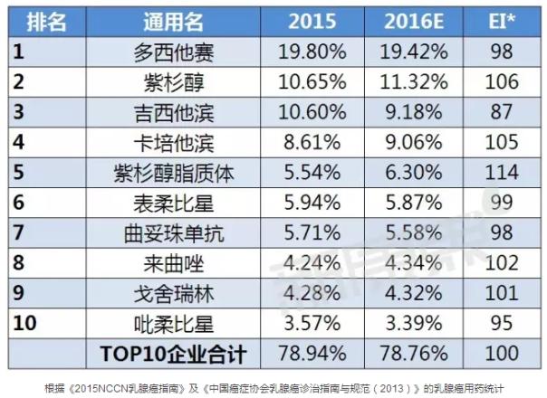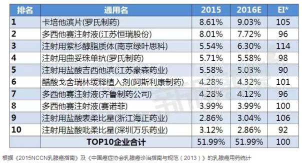 據(jù)中康CMH監(jiān)測(cè)數(shù)據(jù)顯示,2015年乳腺癌用藥前十通用名的規(guī)模為225.94億元,較2014年的市場(chǎng)規(guī)模上升了14.53%,而且前十通用名占了78.94%的市場(chǎng)份額,市場(chǎng)集中度較高;其中多西他賽以19.80%的市場(chǎng)份額位列第一。而2014年以39.93%市場(chǎng)份額雄踞全球榜首的曲妥珠單抗在國(guó)內(nèi)市場(chǎng)表現(xiàn)并不佳,只有5.71%的市場(chǎng)份額。依各通用名產(chǎn)品市場(chǎng)份額變化趨勢(shì)來(lái)看,預(yù)計(jì)2016年乳腺癌用藥TOP10產(chǎn)品中有一半呈增長(zhǎng)趨勢(shì),其中增長(zhǎng)勢(shì)頭最猛的可能是紫杉醇脂質(zhì)體,預(yù)計(jì)多西他賽將繼續(xù)保持第一的名次。