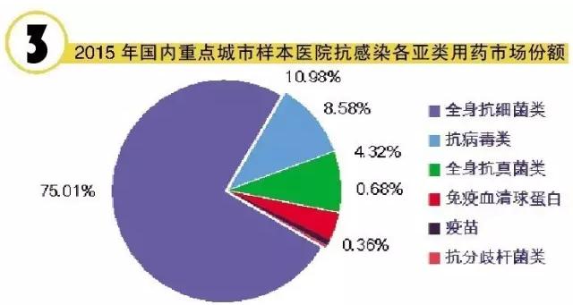 據(jù)CFDA南方醫(yī)藥經(jīng)濟(jì)研究所標(biāo)點(diǎn)信息公司《中國城市公立醫(yī)院化學(xué)藥終端監(jiān)測分析系統(tǒng)(HDM系統(tǒng))》數(shù)據(jù)顯示,2015年,國內(nèi)重點(diǎn)城市樣本醫(yī)院全身抗感染類用藥中,全身抗細(xì)菌類獨(dú)占鰲頭,占據(jù)了75%的份額,其它5個亞類占據(jù)25%(見圖3)。