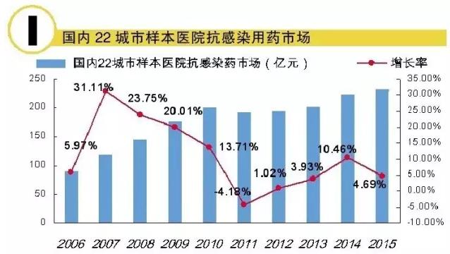 據(jù)中國醫(yī)藥工業(yè)信息中心藥物綜合數(shù)據(jù)庫PDB資料顯示,2015年國內(nèi)22重點(diǎn)城市樣本醫(yī)院抗感染類用藥市場已超過200億元,達(dá)到了232.50億元,同比上一年增長率為4.69%(見圖1)。