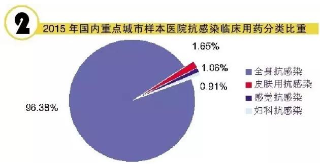 按照統(tǒng)計數(shù)據(jù)顯示:全身抗感染類用藥占據(jù)了96.38%的市場份額。另外,皮膚用抗感染藥物占據(jù)了1.65%,感覺器官抗感染用藥占據(jù)1.06%,婦科抗感染類用藥占據(jù)0.91%(見圖2)。2016年第一季度最新數(shù)據(jù)顯示,國內(nèi)重點(diǎn)城市樣本醫(yī)院抗感染類用藥市場規(guī)模仍然達(dá)到60億元,預(yù)測全年仍呈現(xiàn)出低幅度增長態(tài)勢。