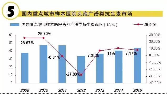 據(jù)HDM系統(tǒng)數(shù)據(jù)顯示,2015年國內(nèi)重點(diǎn)城市樣本醫(yī)院頭孢廣譜類抗生素市場為44.05億元,占據(jù)了頭孢類抗生素市場的60%,同比上一年增長了8.17%(見圖5)。
