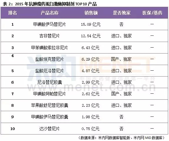 目前我國抗腫瘤藥蛋白激酶抑制劑市場中,暢銷產(chǎn)品多數(shù)是進(jìn)口的獨家產(chǎn)品。數(shù)據(jù)顯示,2015年該藥物市場前十產(chǎn)品中僅有兩個產(chǎn)品是國產(chǎn)獨家,除了2014年獲批上市的甲磺酸阿帕替尼片外,還有2011年獲批上市的鹽酸埃克替尼片。